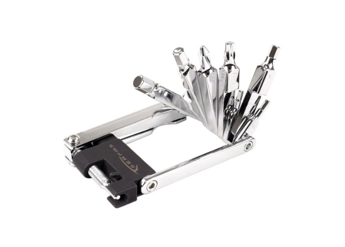 Cuenta con 7 llaves allen (2, 2.5, 3, 4, 5, 6, 7 y 8), un destornillador Torx-T25, un destornillador Philips, un destorrnillador plano y un corta cadena integrado.